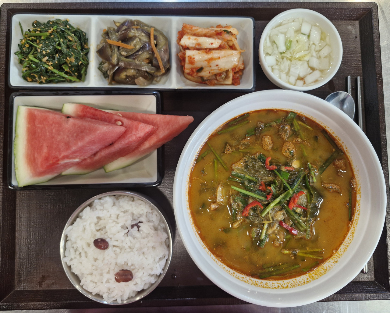 울타리콩밥 / 추어탕 / 가지나물볶음 / 고춧잎무침 / 수박 / 포기김치 / 나박김치