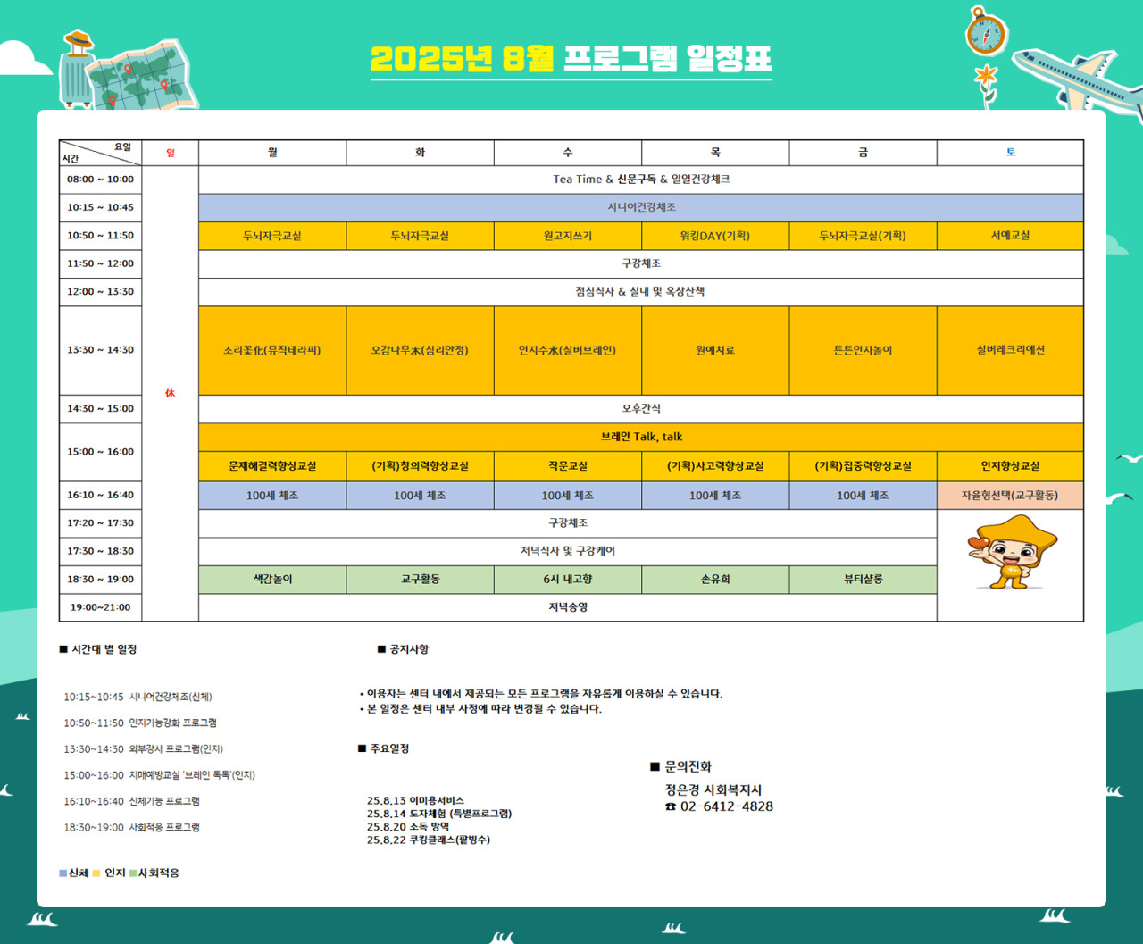 위례케어센터 [프로그램 안내] 2025년 위례케어센터 8월 프로그램 일정표 페이지 정보 작성자 최고관리자 댓글 0건 조회 2,652회 작성일 25-07-31 12:58 목록 본문 목록 이전글[하루의 식단] 2025년 7월 30일 25.07.31 다음글[오늘의 식단] 2025년 07월 30일 중식 25.07.31