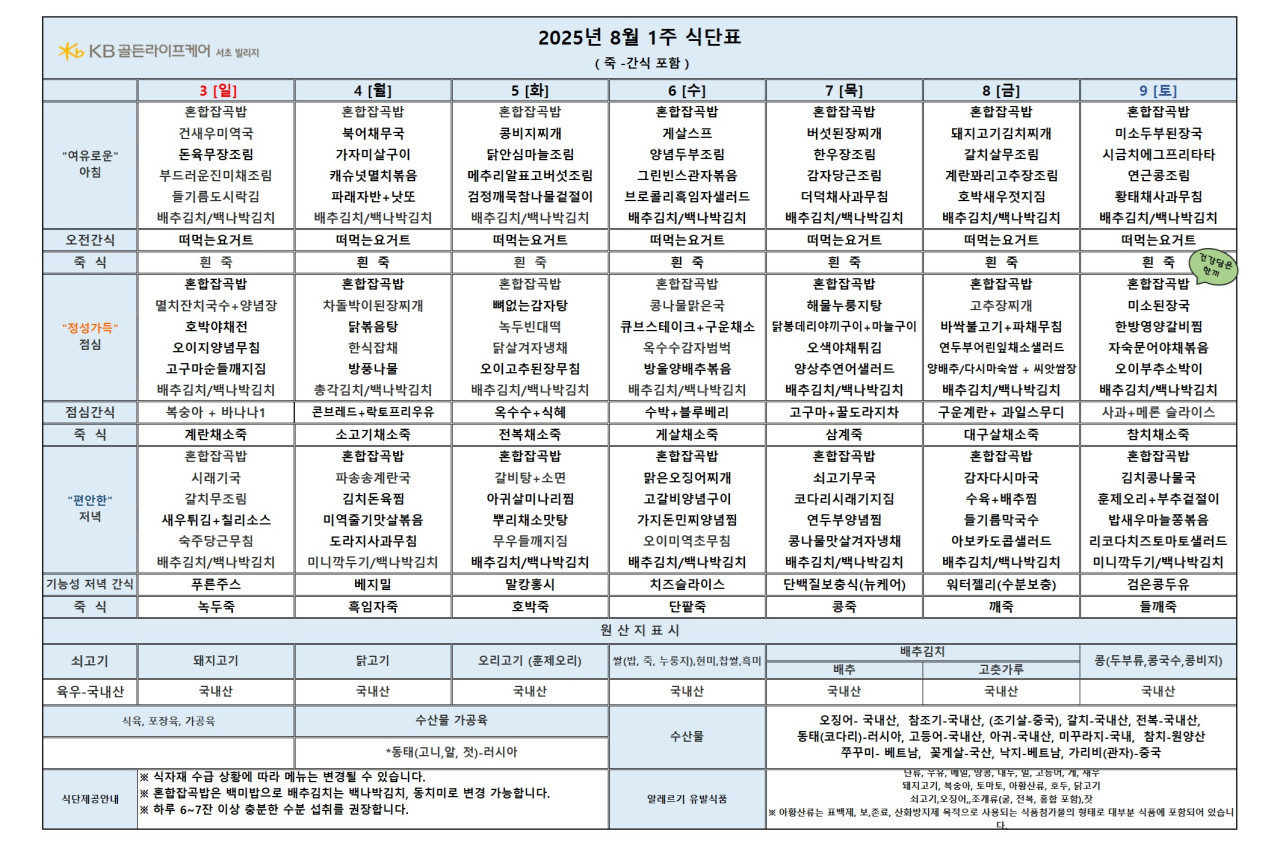 서초빌리지 서초 빌리지 2025년 8월 1주차 식단표