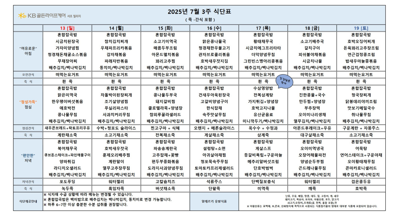 서초빌리지 서초 빌리지 2025년 7월 3주차 식단표