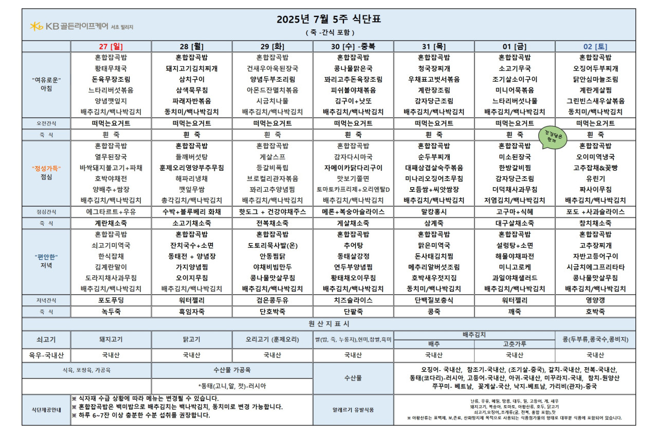 서초빌리지 서초 빌리지 2025년 7월 5주차 식단표