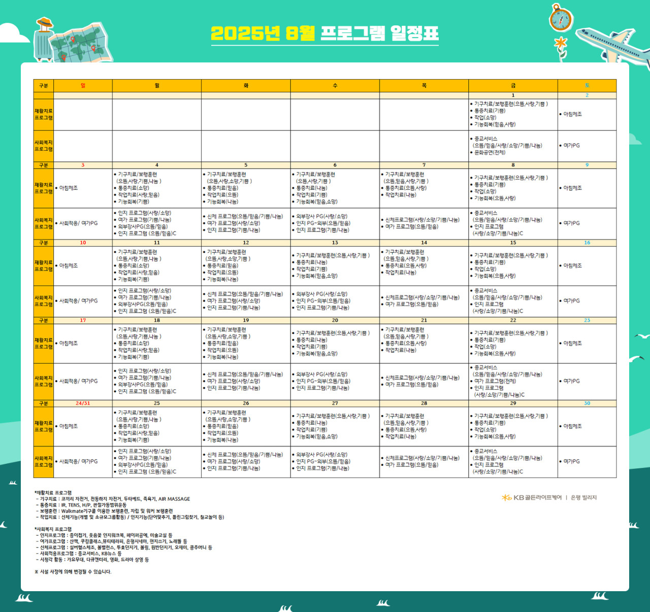 은평빌리지 [프로그램 안내] 2025년 은평 빌리지 8월 프로그램 일정표 페이지 정보 작성자 최고관리자 댓글 0건 조회 2,416회 작성일 25-07-28 11:26 목록 본문 . 목록 이전글[오늘의 식단] 2025년 7월 29일 중식 및 석식 25.07.29 다음글서초 빌리지 2025년 7월 5주차 식단표 25.07.28