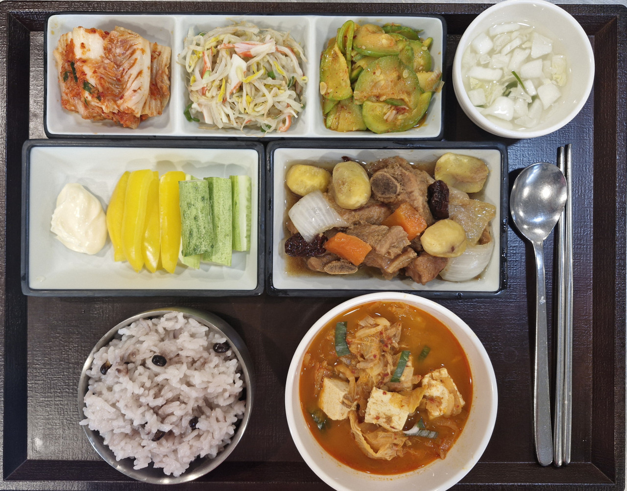 약콩밥 /  참치김치찌개  / 한방갈비찜 /  애호박새우젓볶음 / 숙주겨자무침 / 야채스틱 / 포기김치 / 나박김치