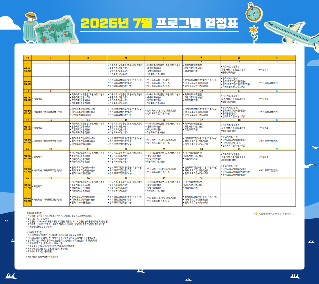 은평빌리지 [프로그램 안내] 2025년 은평 빌리지 7월 프로그램 일정표 페이지 정보 작성자 최고관리자 댓글 0건 조회 4,099회 작성일 25-06-26 14:15 목록 본문 . 목록 이전글[프로그램안내] 2025년 서초 빌리지 7월 프로그램 일정표 25.06.27 다음글[식단안내] 2025년 7월 1주차 식단표 25.06.26