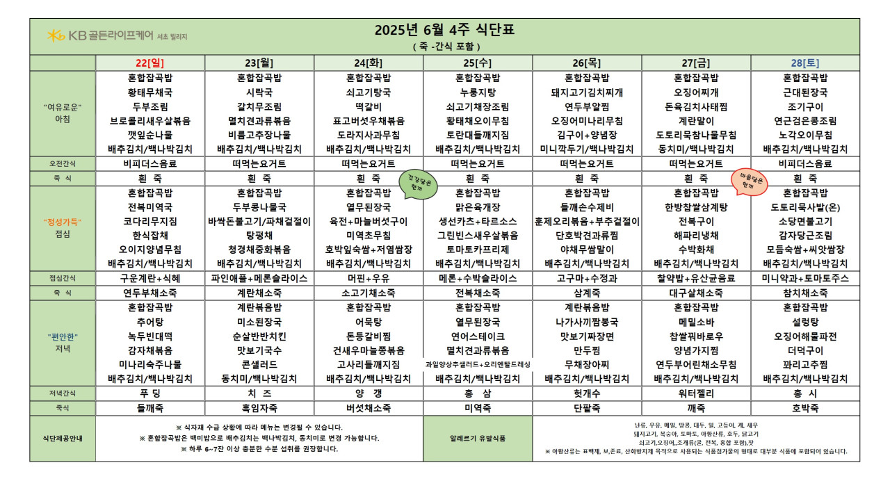서초빌리지 서초 빌리지 2025년 6월 4주차 식단표