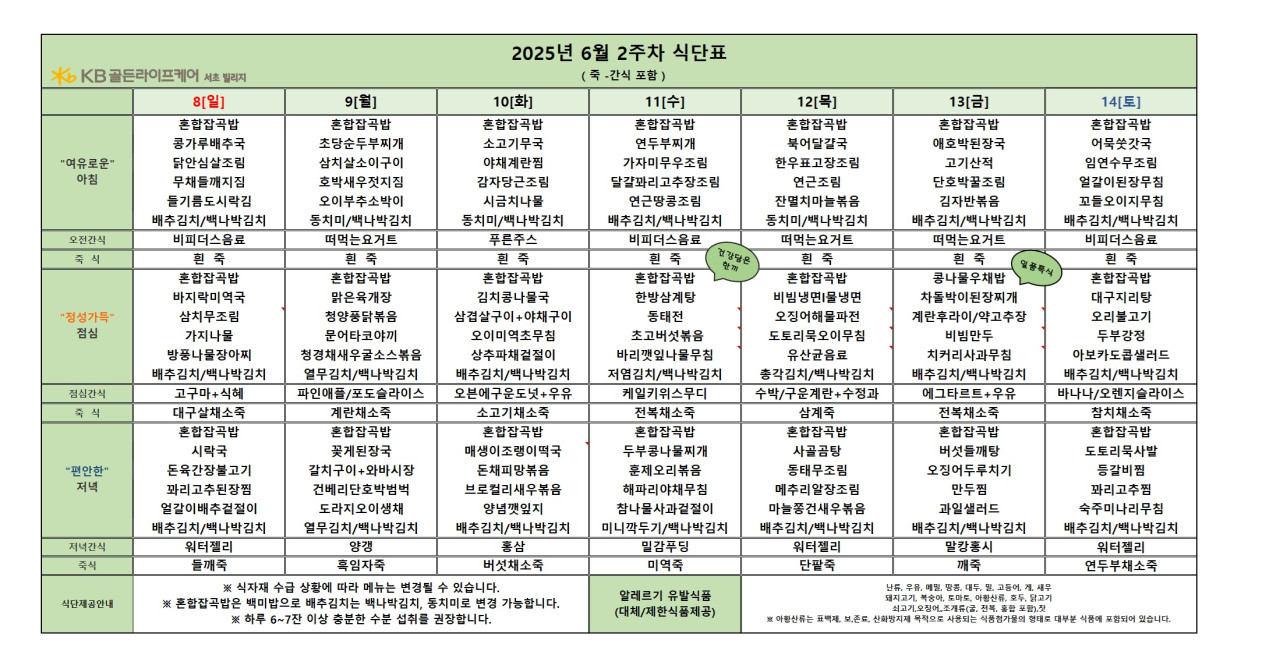 서초빌리지 [식단안내] 서초 빌리지 2025년 6월 2주차 식단표