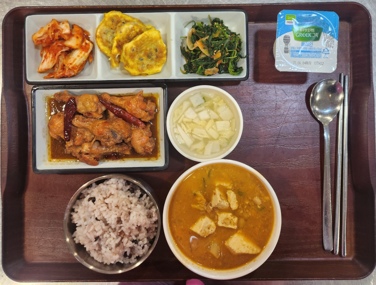 약콩밥 / 청국장찌개 / 닭봉조림 / 해물동그랑땡전 / 비름나물무침 / 그릭요거트 / 포기김치 / 물김치