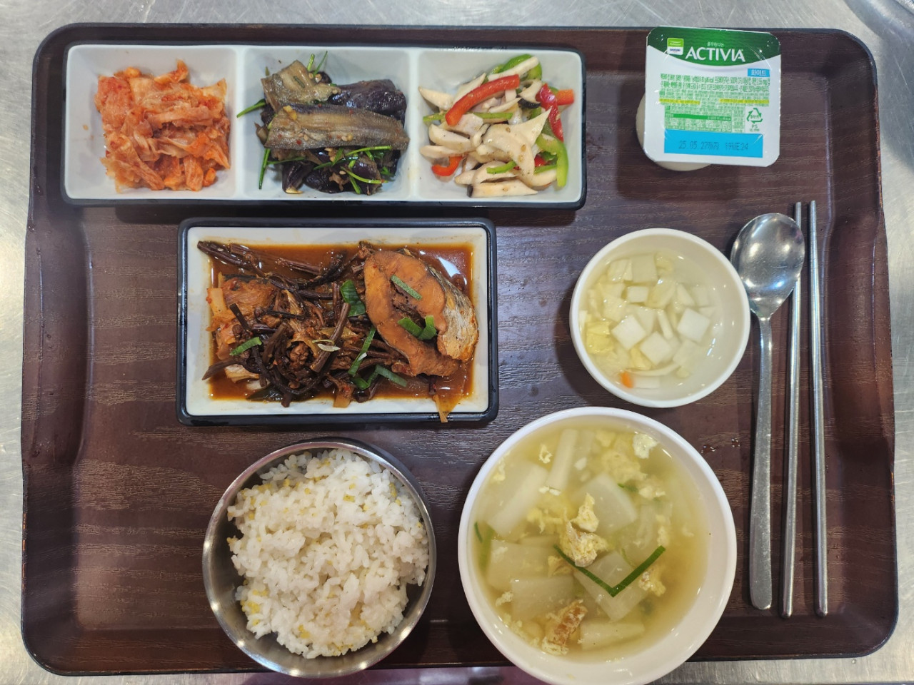 기장밥  /  북어계란국  / 삼치고사리지짐 /  새송이피망볶음 / 찐가지무침 / 무가당요플레 / 포기김치 / 나박김치