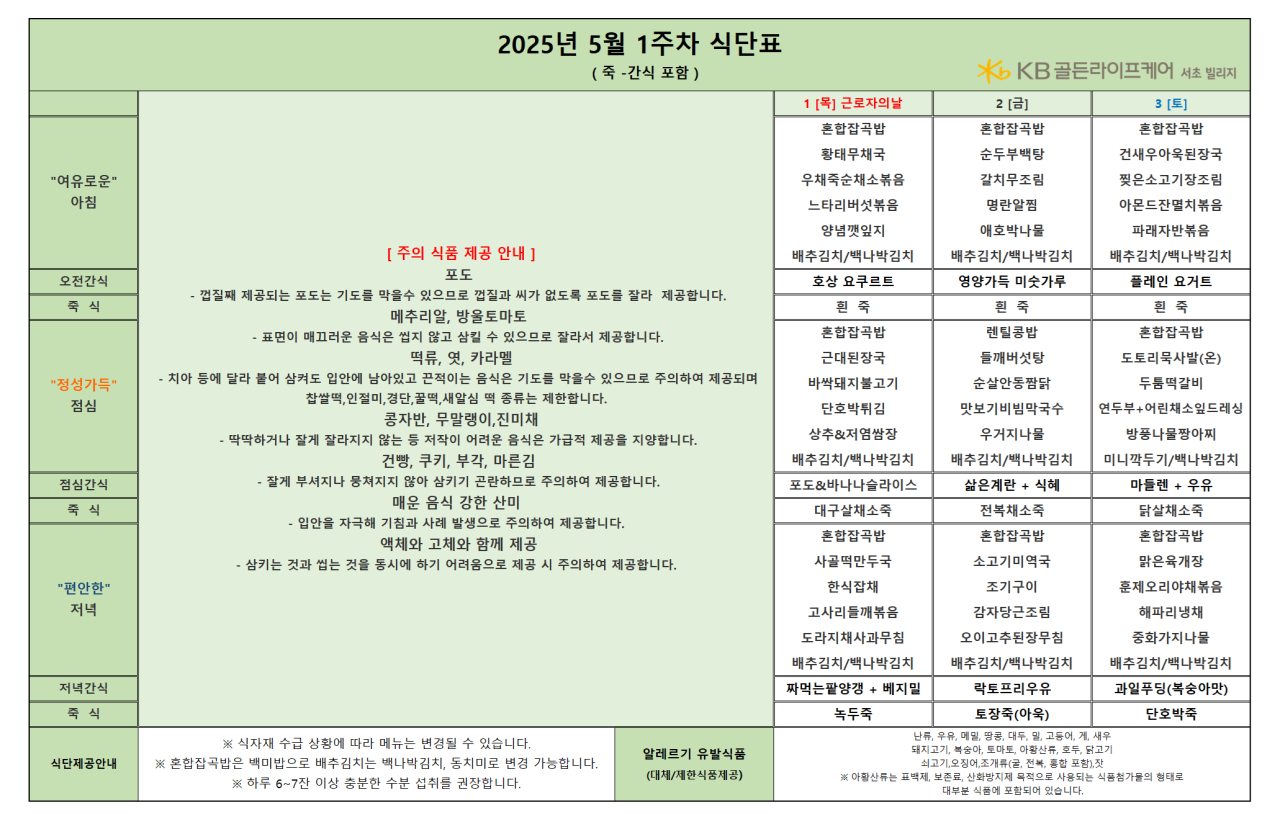 [식단안내] 서초 빌리지 2025년 5월 1주차