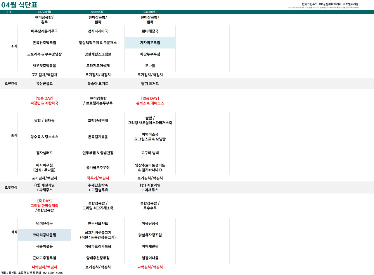 서초빌리지 [식단안내] 서초 빌리지 25년 04월 5주차 식단표 페이지 정보 작성자 최고관리자 댓글 0건 조회 2,560회 작성일 25-04-11 13:28 목록 본문 목록 이전글[오늘의 식단] 2025년 4월 17일 중식 25.04.17 다음글[식단안내] 서초 빌리지 25년 04월 4주차 식단표 25.04.11