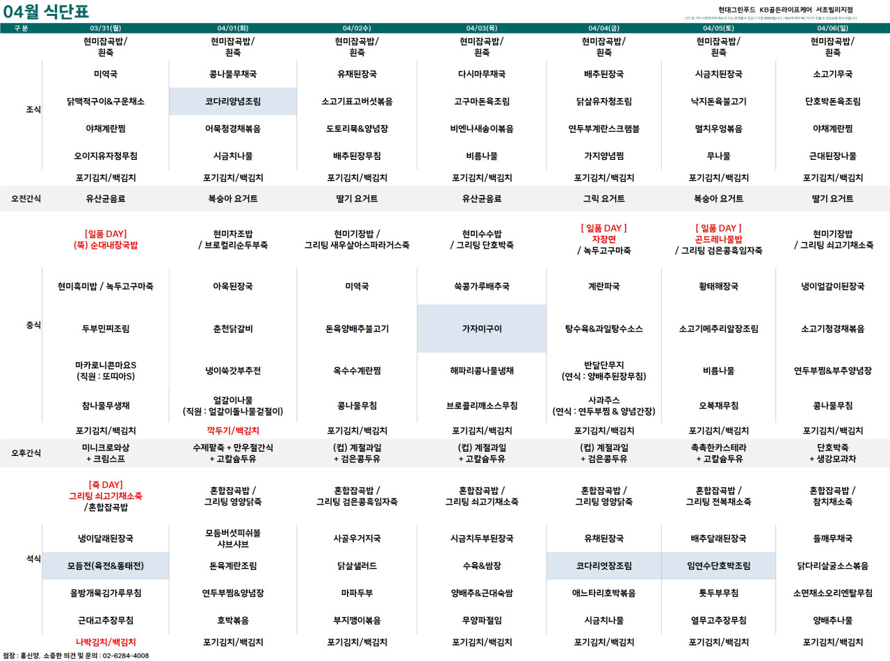 서초빌리지 [식단안내] 서초 빌리지 25년 04월 1주차 식단표 페이지 정보 작성자 최고관리자 댓글 0건 조회 3,531회 작성일 25-03-29 10:05 목록 본문 목록 이전글[프로그램 안내] 2025년 위례케어센터 4월 프로그램 일정표 25.03.29 다음글[프로그램안내] 2025년 서초 빌리지 4월 프로그램 일정표 25.03.28