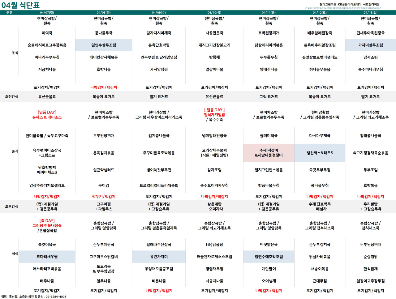 서초빌리지 [식단안내] 서초 빌리지 25년 04월 2주차 식단표 페이지 정보 작성자 최고관리자 댓글 0건 조회 2,774회 작성일 25-04-04 15:13 목록 본문 목록 이전글[하루의 식단] 2025년 4월 4일 25.04.04 다음글[오늘의 식단] 2025년 4월 4일 중식 25.04.04