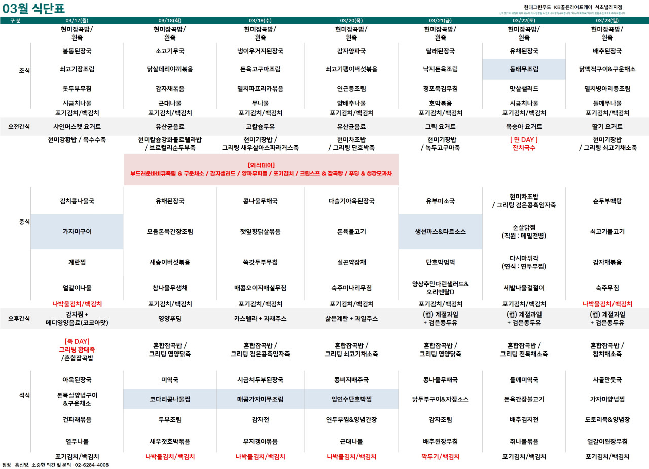 서초빌리지 [식단안내] 서초 빌리지 25년 03월 3주차 식단표 페이지 정보 작성자 최고관리자 댓글 0건 조회 3,254회 작성일 25-03-10 14:24 목록 본문 목록 이전글[오늘의 식단] 2025년 03월 10일 중식 25.03.10 다음글[오늘의 식단] 2025년 3월 7일 중식 25.03.07