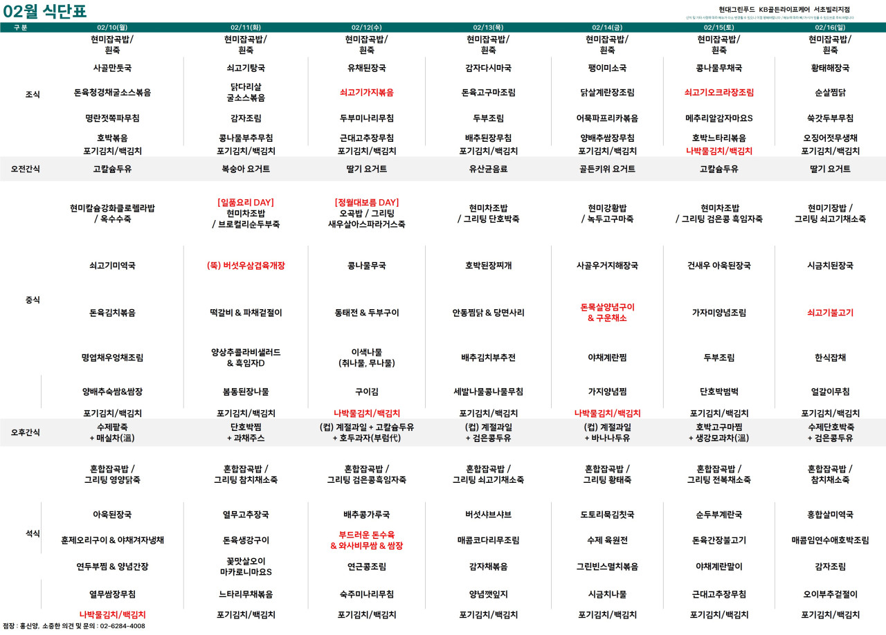 서초빌리지 [식단안내] 서초 빌리지 25년 02월 2주차 식단표 페이지 정보 작성자 최고관리자 댓글 0건 조회 3,003회 작성일 25-02-05 18:45 목록 본문 목록 이전글[하루의 식단]2025년 2월 5일 25.02.06 다음글[식단안내] 서초 빌리지 25년 02월 1주차 식단표 25.02.05