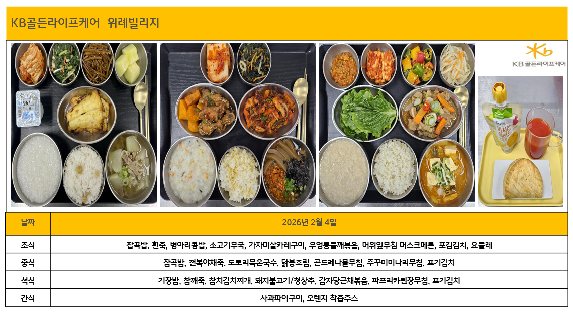 위례빌리지 [하루의 식단] 2026년 2월 4일 페이지 정보 작성자 최고관리자 댓글 0건 조회 130회 작성일 26-02-05 18:02 목록 본문 목록 이전글[하루의 식단] 2026년 2월 4일 (조/중/석) 26.02.05 다음글[프로그램 안내] 2026년 위례케어센터 1월 프로그램 일정표 26.02.03