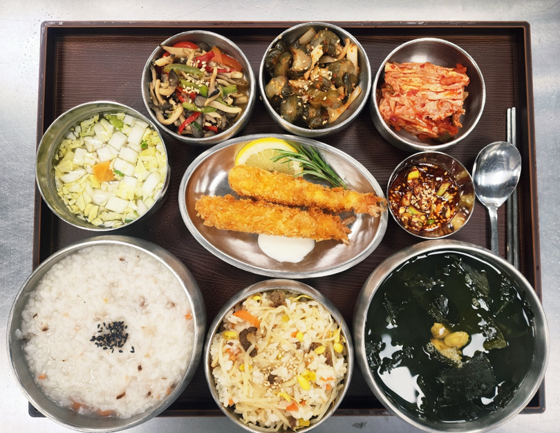 쇠고기콩나물밥/표고죽,바지락살미역국,왕새우튀김&타르타르소스,파프리카버섯볶음,오이지무침,저염포기김치/나박김치
