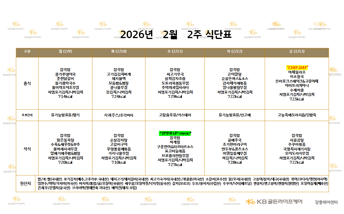 강동케어센터 [식단안내] 2025년 2월 2주 식단표 페이지 정보 작성자 최고관리자 댓글 0건 조회 40회 작성일 26-02-06 16:32 목록 본문 목록 이전글[식단안내] 2026년 2월 2주 식단표 26.02.06 다음글[오늘의 식단] 25년 2월 3일 화요일 중식 26.02.06
