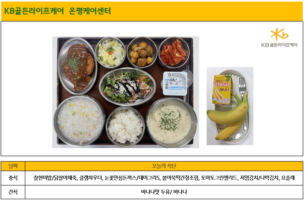 은평케어센터 [오늘의식단] 2026년 2월 5일 (목) 중식 페이지 정보 작성자 최고관리자 댓글 0건 조회 44회 작성일 26-02-07 09:40 목록 본문 목록 이전글[하루의식단] 2026년 2월 6일 (금요일) 조/중/석식 26.02.07 다음글[식단안내] 2026년 2월 2주 식단표 26.02.06
