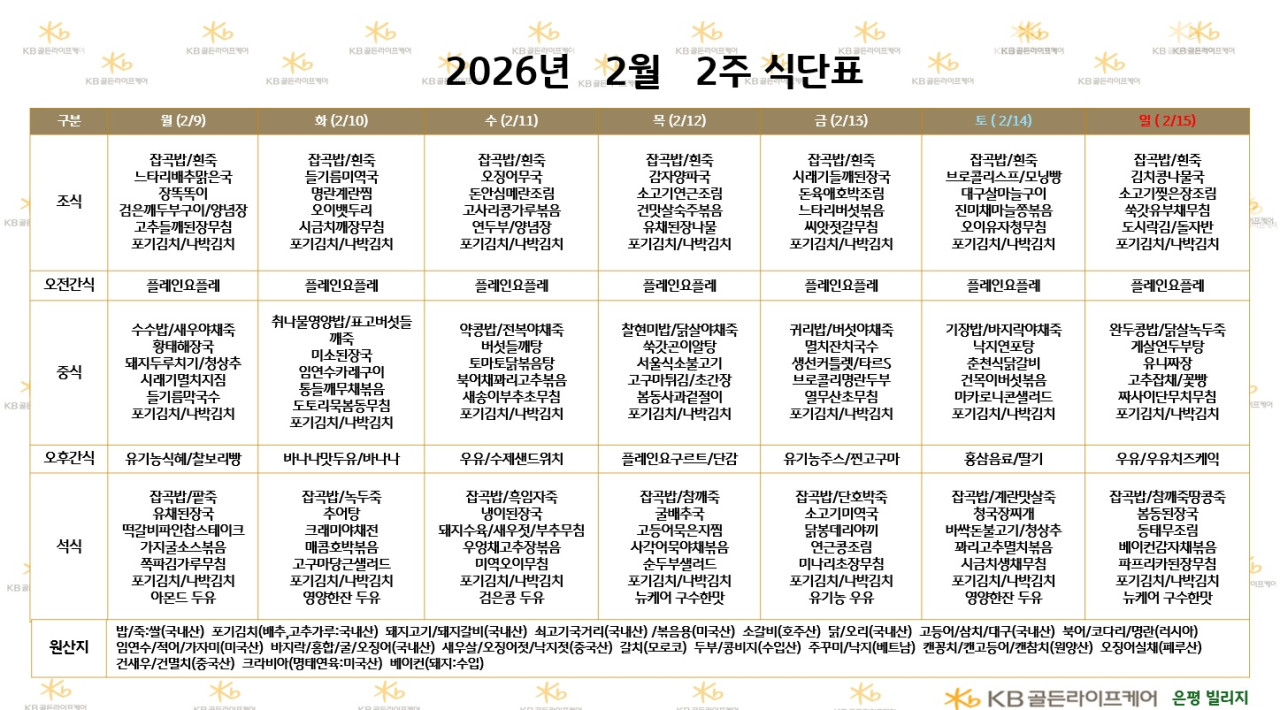은평빌리지 [식단안내] 2026년 2월 2주차 식단표 페이지 정보 작성자 최고관리자 댓글 0건 조회 55회 작성일 26-02-07 09:42 목록 본문 목록 이전글[식단안내] 2026년 2월 2주차 식단표 26.02.09 다음글[하루의식단] 2026년 2월 6일 (금요일) 조/중/석식 26.02.07