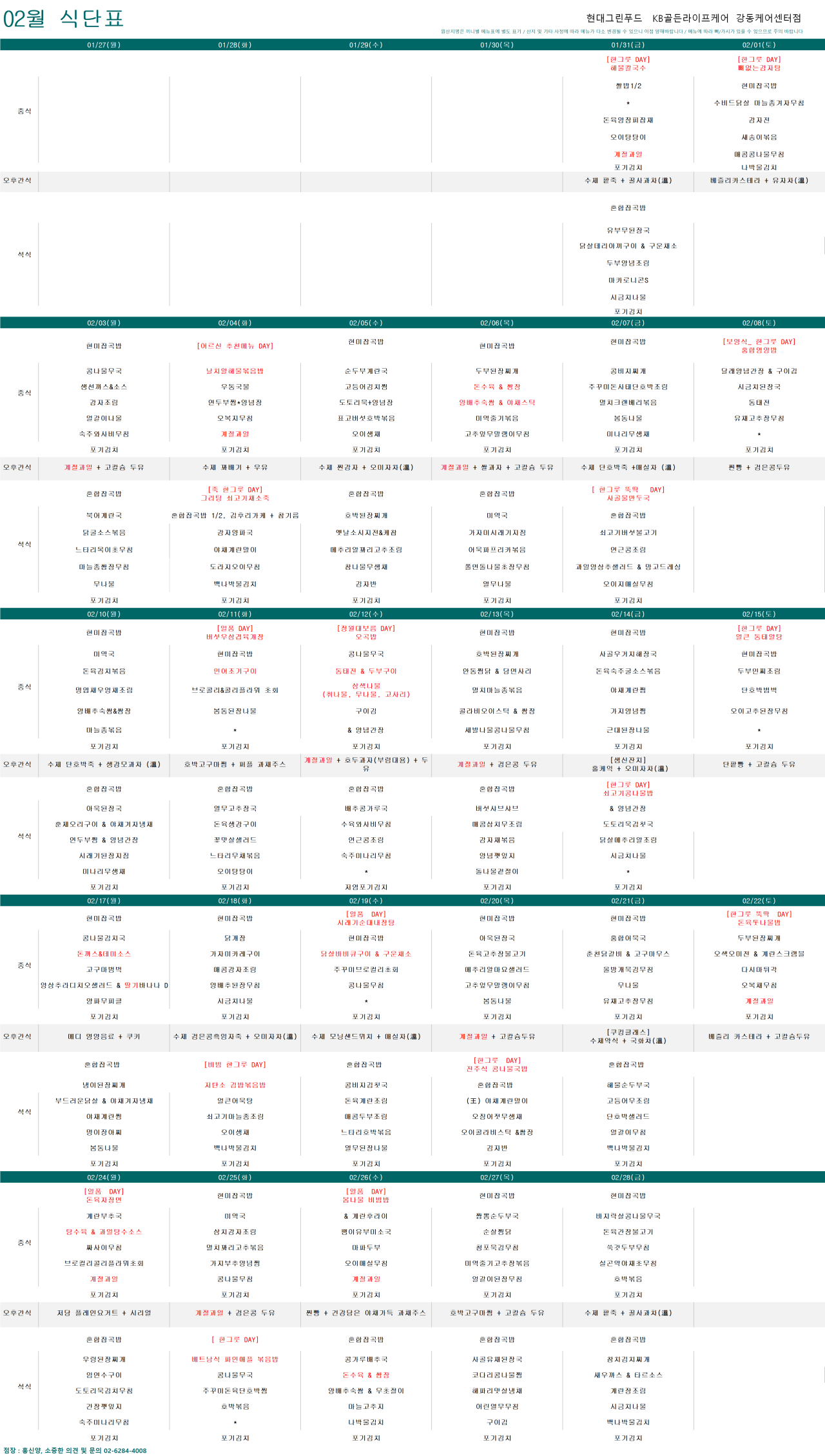 강동케어센터 [식단안내] 2025년 강동케어센터 2월 식단표 페이지 정보 작성자 최고관리자 댓글 0건 조회 3,585회 작성일 25-01-23 14:53 목록 본문 목록 이전글[식단안내] 위례 빌리지 1월 5주차 식단표 25.01.24 다음글[프로그램안내] 2025년 서초 빌리지 2월 프로그램 일정표 25.01.21