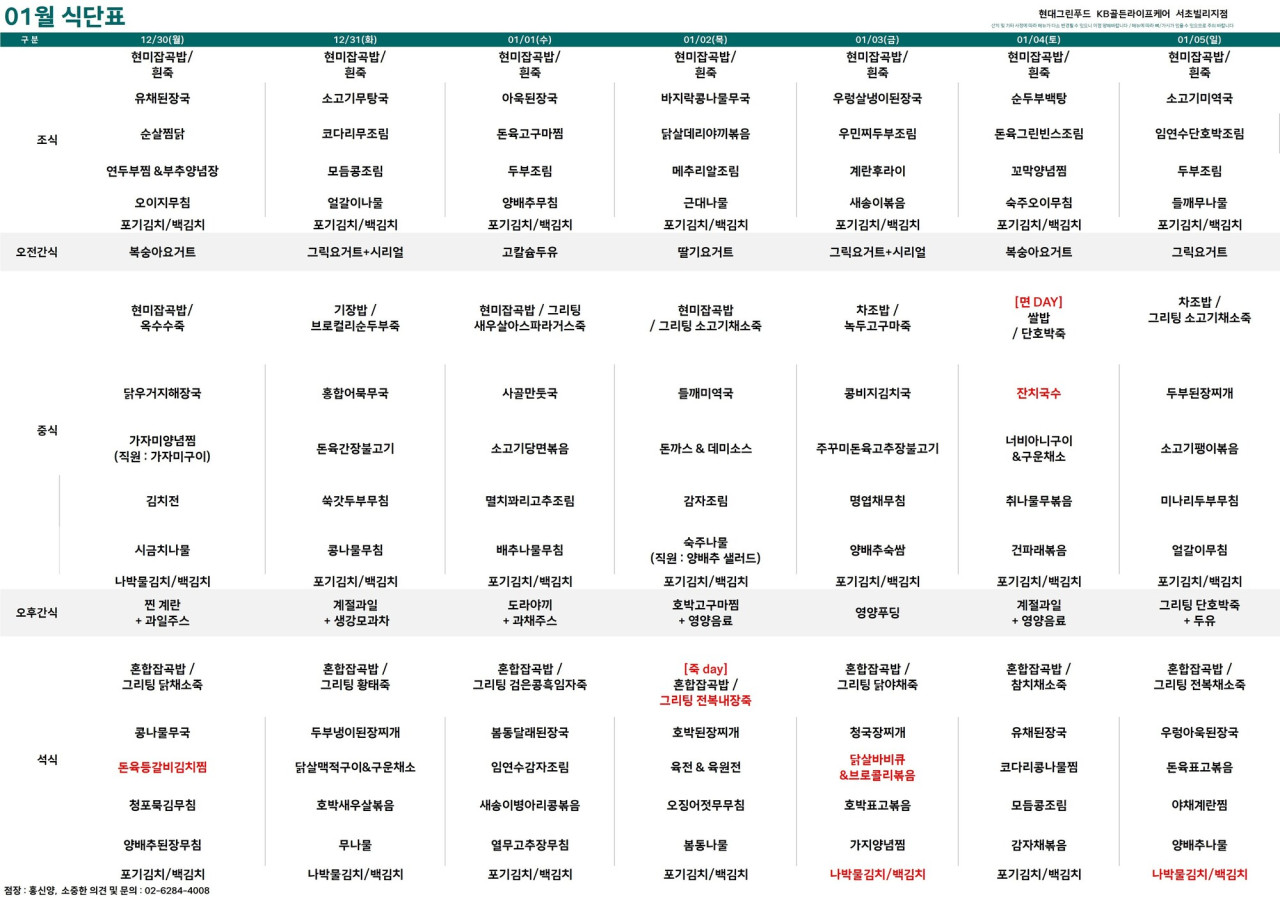 서초빌리지 [식단안내] 서초 빌리지 25년 01월 1주차 식단표 페이지 정보 작성자 KB 골든라이프케어 댓글 0건 조회 2,711회 작성일 24-12-27 09:34 목록 본문 목록 이전글 25.01.09 다음글[식단안내] 위례 빌리지 1월 1주차 식단표 24.12.26