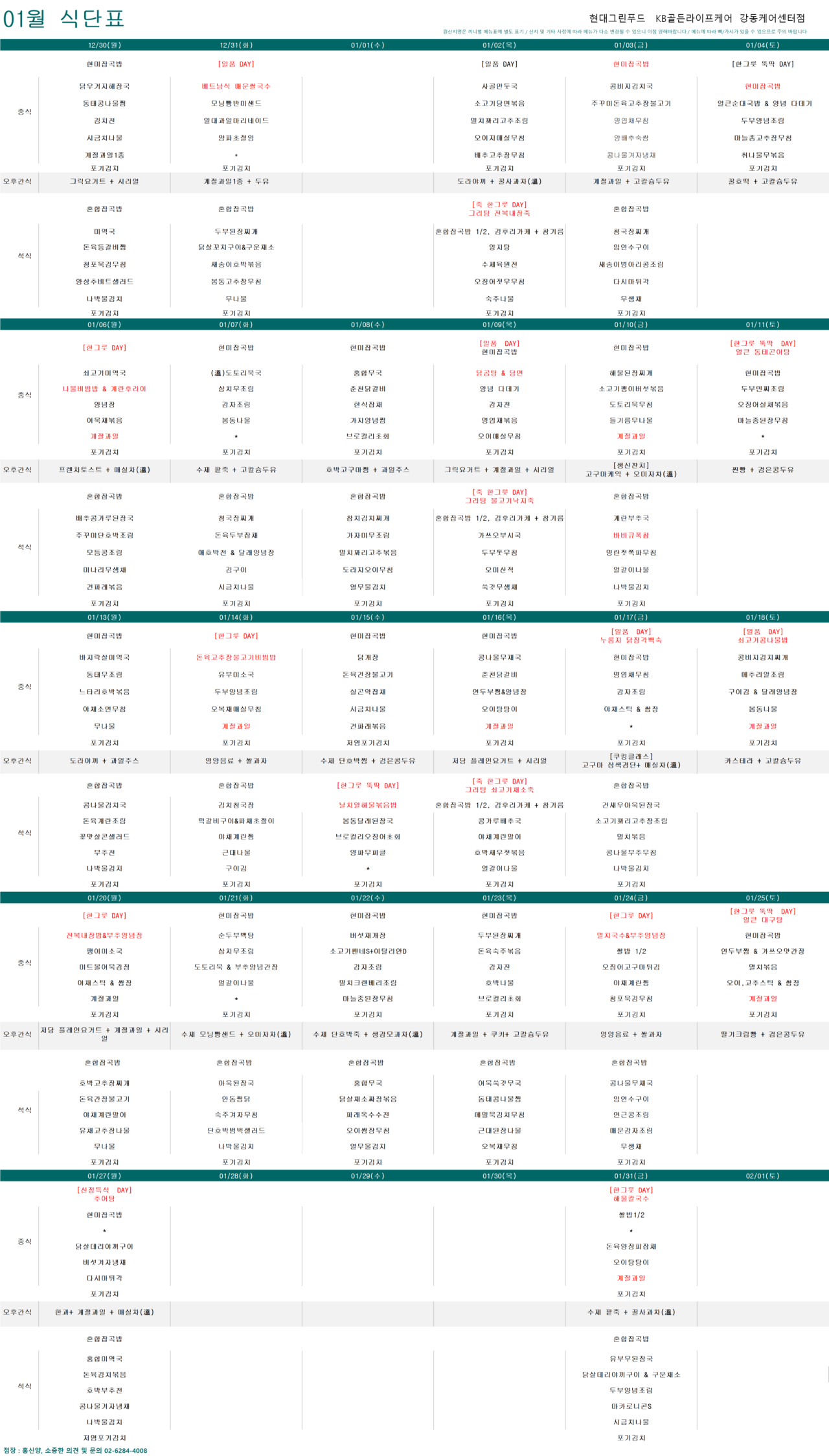 강동케어센터 [식단안내] 2025년 강동케어센터 1월 식단표 페이지 정보 작성자 KB 골든라이프케어 댓글 0건 조회 3,445회 작성일 24-12-31 17:50 목록 본문 목록 이전글[하루의 식단] 2025년 1월 2일 25.01.02 다음글[프로그램 안내] 2025년 강동케어센터 1월 프로그램 일정표 24.12.31