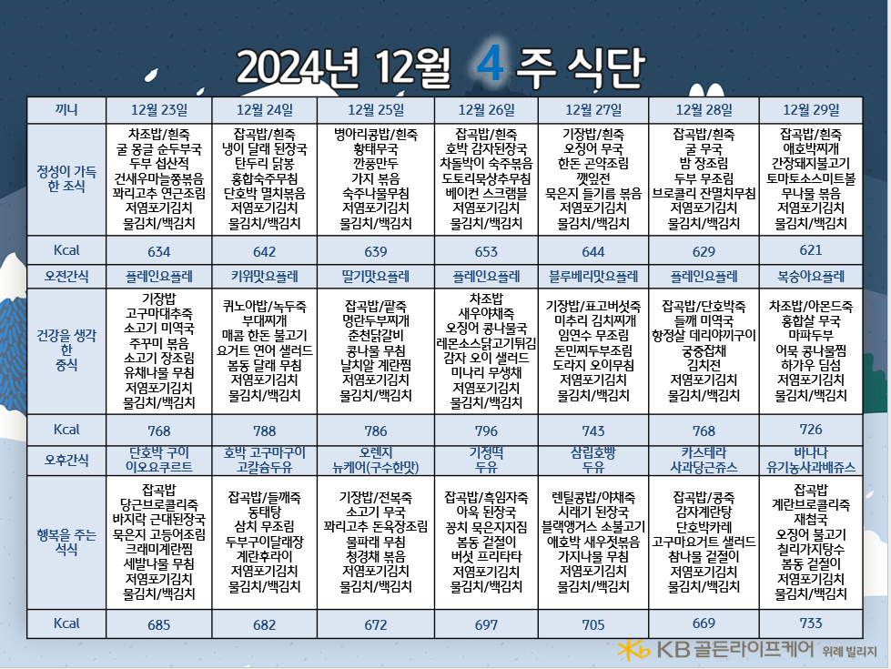 위례빌리지 [식단안내] 위례 빌리지 12월 4주차 식단표 페이지 정보 작성자 KB 골든라이프케어 댓글 0건 조회 2,726회 작성일 24-12-20 12:41 목록 본문 목록 이전글[오늘의 식단] 2024년 12월 24일 중식 24.12.24 다음글[식단안내] 위례 케어센터 12월 4주차 식단표 24.12.20
