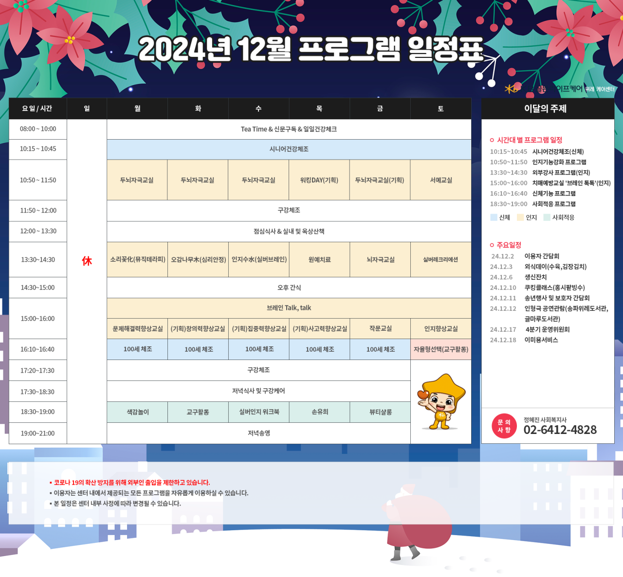 위례케어센터 [프로그램 안내] 2024년 위례케어센터 12월 프로그램 일정표 페이지 정보 작성자 KB 골든라이프케어 댓글 0건 조회 3,794회 작성일 24-11-30 17:55 목록 본문 목록 이전글[하루의 식단] 2024년 11월 29일 24.12.01 다음글[프로그램안내] 2024년 서초 빌리지 12월 프로그램 일정표 24.11.29
