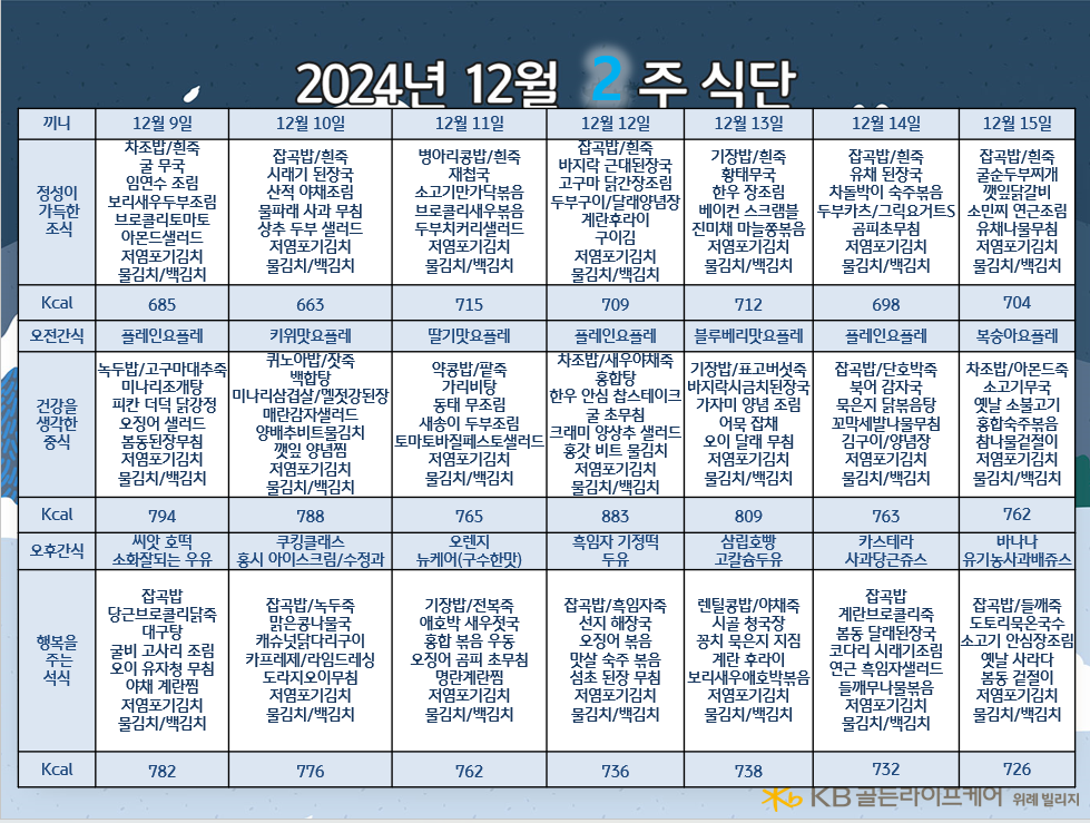 위례빌리지 [식단안내] 위례 빌리지 12월 2주차 식단표 페이지 정보 작성자 KB 골든라이프케어 댓글 0건 조회 2,687회 작성일 24-12-06 12:01 목록 본문 목록 이전글[식단안내] 서초 빌리지 12월 2주차 식단표 24.12.06 다음글[하루의 식단] 2024년 12월 5일 24.12.06