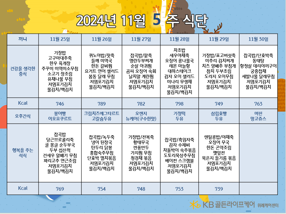 위례케어센터 [식단안내] 위례 케어센터 11월 5주차 식단표 페이지 정보 작성자 KB 골든라이프케어 댓글 0건 조회 2,714회 작성일 24-11-21 19:16 목록 본문 목록 이전글[식단안내] 위례 빌리지 11월 5주차 식단표 24.11.21 다음글[하루의 식단] 2024년 11월 20일 24.11.20