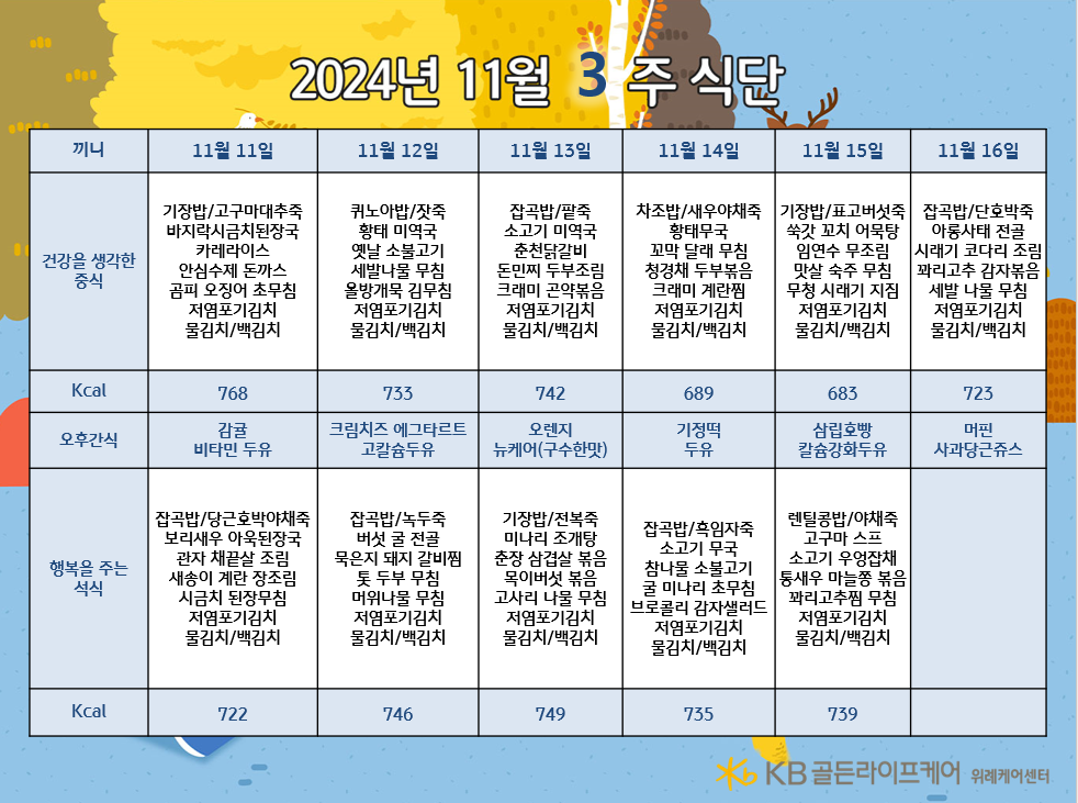 위례케어센터 [식단안내] 위례 케어센터 11월 3주차 식단표 페이지 정보 작성자 KB 골든라이프케어 댓글 0건 조회 2,678회 작성일 24-11-08 14:29 목록 본문 목록 이전글[식단안내] 위례 빌리지 11월 3주차 식단표 24.11.08 다음글[오늘의 식단] 2024년 11월 7일 중식 24.11.08