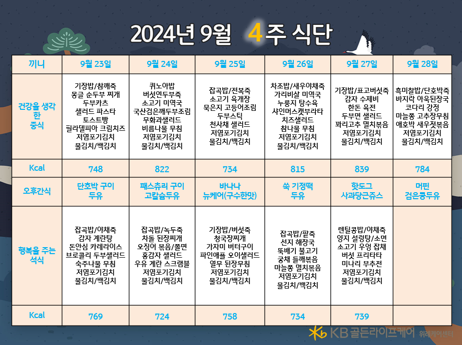 위례케어센터 [식단안내] 위례 케어센터 9월 4주차 식단표 페이지 정보 작성자 KB 골든라이프케어 댓글 0건 조회 2,481회 작성일 24-09-20 16:06 목록 본문 목록 이전글[식단안내] 위례 빌리지 9월 4주차 식단표 24.09.20 다음글[오늘의 식단] 2024년 9월 20일 중식 24.09.20