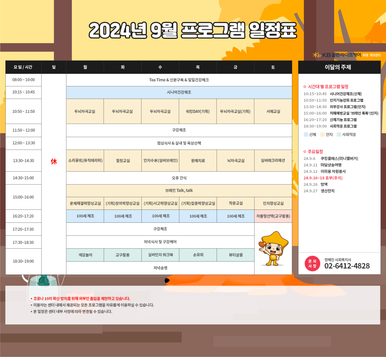 위례케어센터 [프로그램 안내] 2024년 위례케어센터 9월 프로그램 일정표 페이지 정보 작성자 KB 골든라이프케어 댓글 0건 조회 3,842회 작성일 24-08-29 14:49 목록 본문 목록 이전글[식단안내] 위례 케어센터 9월 1주차 식단표 24.08.30 다음글[오늘의 식단] 2024년 8월 29일 24.08.29