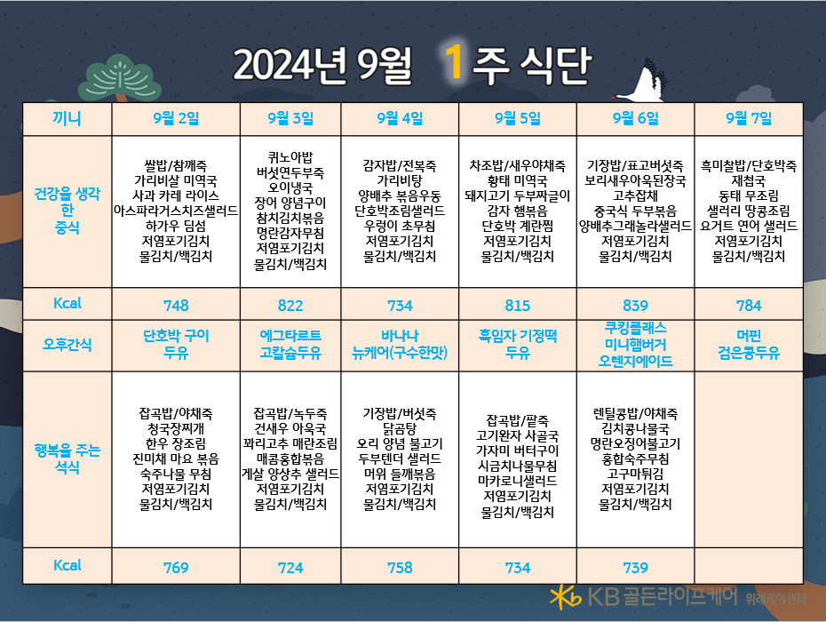 위례케어센터 [식단안내] 위례 케어센터 9월 1주차 식단표 페이지 정보 작성자 KB 골든라이프케어 댓글 0건 조회 2,520회 작성일 24-08-30 10:24 목록 본문 목록 이전글[오늘의 식단] 2024년 08월 30일 중식 24.08.30 다음글[프로그램 안내] 2024년 위례케어센터 9월 프로그램 일정표 24.08.29