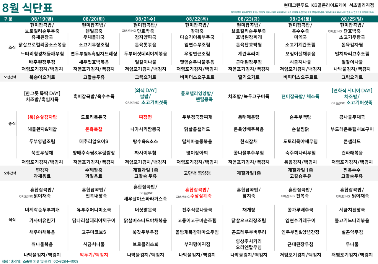 서초빌리지 [식단안내] 서초 빌리지 8월 3주차 식단표 페이지 정보 작성자 KB 골든라이프케어 댓글 0건 조회 2,519회 작성일 24-08-16 09:00 목록 본문 목록 이전글[식단안내] 위례 케어센터 8월 4주차 식단표 24.08.18 다음글[하루의 식단] 2024년 8월 14일 24.08.14