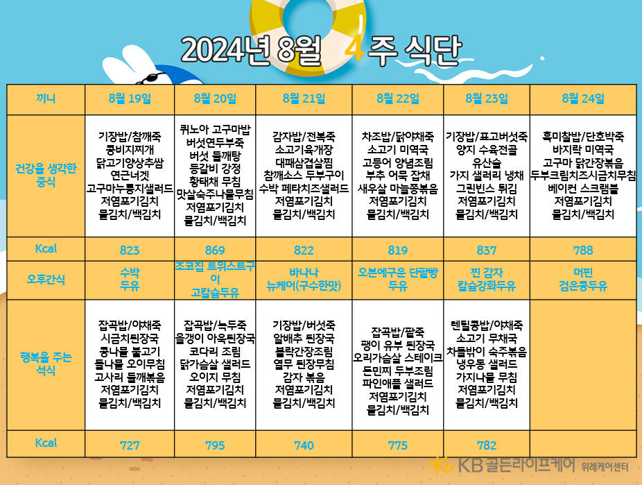 위례케어센터 [식단안내] 위례 케어센터 8월 4주차 식단표 페이지 정보 작성자 KB 골든라이프케어 댓글 0건 조회 2,647회 작성일 24-08-18 10:57 목록 본문 목록 이전글[식단안내] 위례 빌리지 8월 4주차 식단표 24.08.18 다음글[식단안내] 서초 빌리지 8월 3주차 식단표 24.08.16