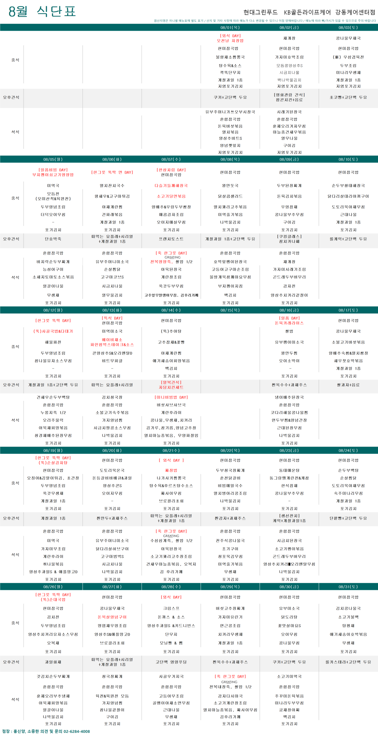 강동케어센터 [식단안내] 2024년 강동케어센터 8월 식단표 페이지 정보 작성자 KB 골든라이프케어 댓글 0건 조회 3,575회 작성일 24-08-01 10:40 목록 본문 목록 이전글[오늘의 식단] 2024년 08월 01일 중식 24.08.01 다음글[프로그램 안내] 2024년 강동케어센터 8월 프로그램 일정표 24.08.01
