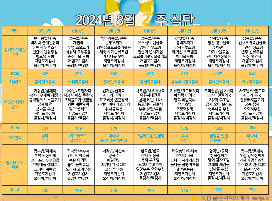 위례빌리지 [식단안내] 위례 빌리지 8월 2주차 식단표 페이지 정보 작성자 KB 골든라이프케어 댓글 0건 조회 2,514회 작성일 24-08-01 14:21 목록 본문 목록 이전글[식단안내] 서초 빌리지 8월 1주차 식단표 24.08.02 다음글[식단안내] 위례 케어센터 8월 2주차 식단표 24.08.01