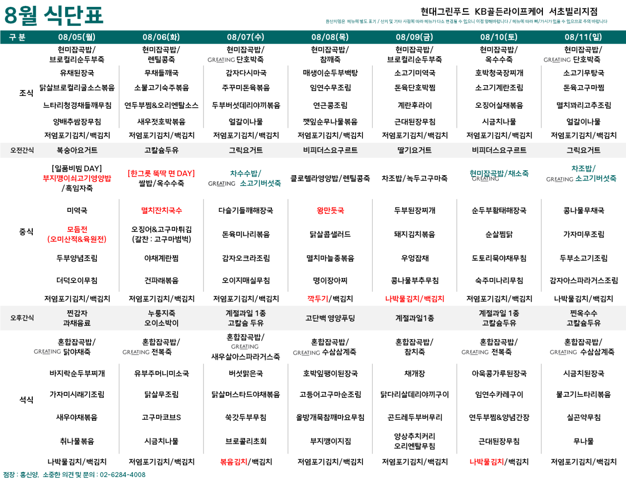 서초빌리지 [식단안내] 서초 빌리지 8월 1주차 식단표 페이지 정보 작성자 KB 골든라이프케어 댓글 0건 조회 2,469회 작성일 24-08-02 09:20 목록 본문 목록 이전글[오늘의 식단] 2024년 08월 02일 중식 24.08.02 다음글[식단안내] 위례 빌리지 8월 2주차 식단표 24.08.01