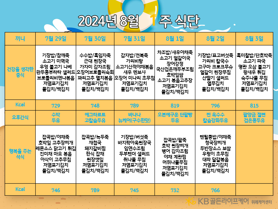 위례케어센터 [식단안내] 위례 케어센터 8월 1주차 식단표 페이지 정보 작성자 KB 골든라이프케어 댓글 0건 조회 2,488회 작성일 24-07-25 17:11 목록 본문 목록 이전글[식단안내] 위례 빌리지 8월 1주차 식단표 24.07.25 다음글[하루의 식단] 2024년 7월 25일 24.07.25