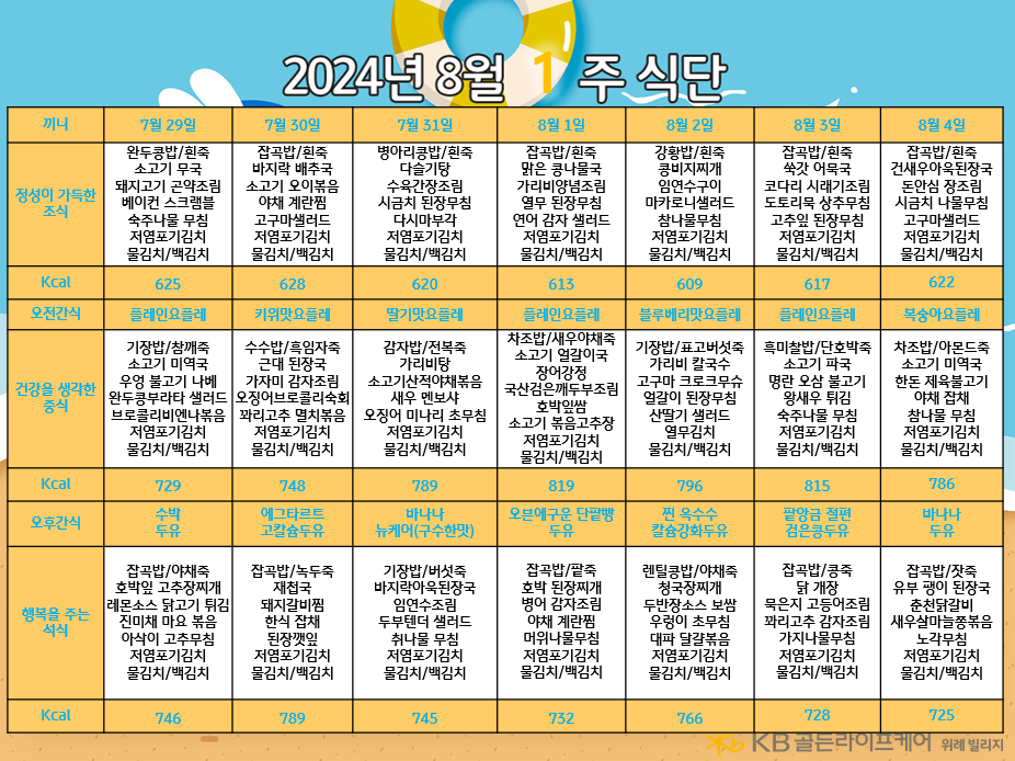 위례빌리지 [식단안내] 위례 빌리지 8월 1주차 식단표 페이지 정보 작성자 KB 골든라이프케어 댓글 0건 조회 2,540회 작성일 24-07-25 17:12 목록 본문 목록 이전글[하루의 식단] 2024년 7월 26일 24.07.29 다음글[식단안내] 위례 케어센터 8월 1주차 식단표 24.07.25