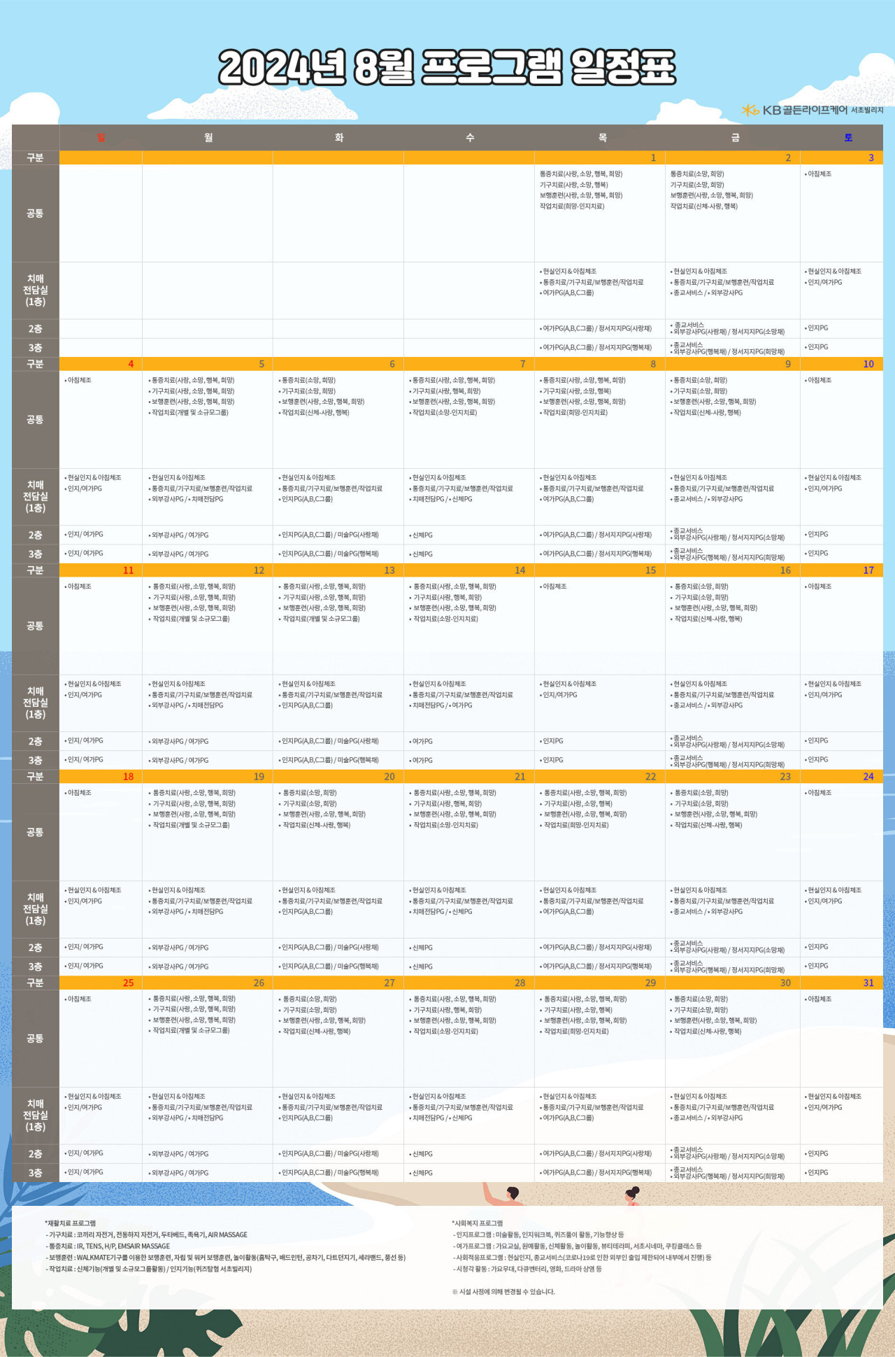 서초빌리지 [프로그램 안내] 2024년 서초 빌리지 8월 프로그램 일정표 페이지 정보 작성자 KB 골든라이프케어 댓글 0건 조회 3,162회 작성일 24-07-30 11:48 목록 본문 목록 이전글[오늘의 식단] 2024년 7월 30일 중식 24.07.30 다음글[오늘의 식단] 2024년 07월 30일 중식 24.07.30