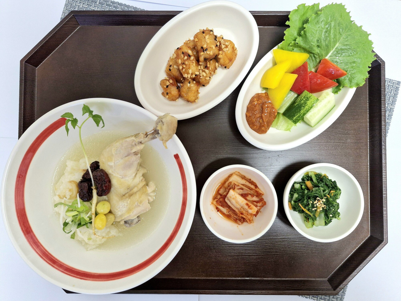 수삼삼계탕 / 깐풍두부 / 상추쌈&야채스틱 (죽, 갈찬 : 근대된장나물) / 구운소금 / 요구르트 / 구이김 (비상찬) / 저염포기김치