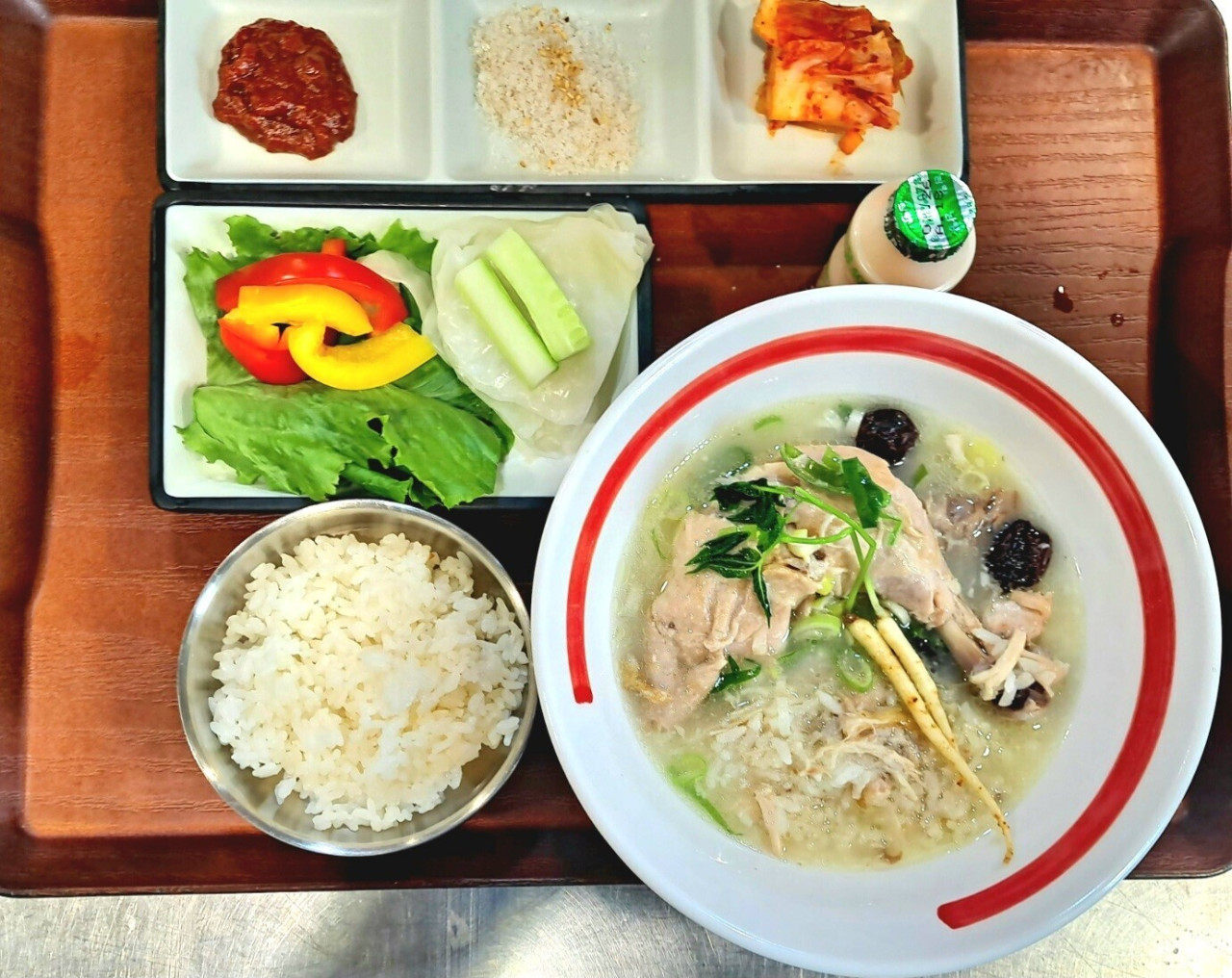 수삼삼계탕 / 상추&야채스틱 / 쌈장, 구운소금 / 수삼영양죽 / 잡곡밥 / 요구르트