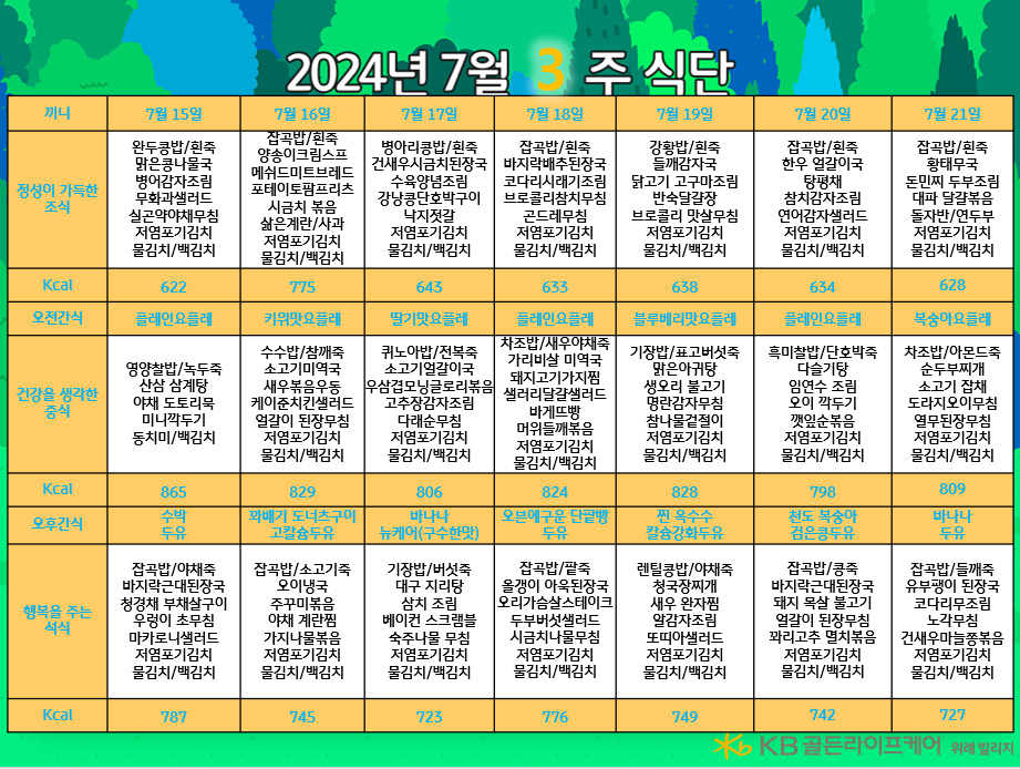 위례빌리지 [식단안내] 위례 빌리지 7월 3주차 식단표 페이지 정보 작성자 KB 골든라이프케어 댓글 0건 조회 2,364회 작성일 24-07-11 16:49 목록 본문 목록 이전글[하루의 식단] 2024년 7월 11일 24.07.11 다음글[식단안내] 위례 케어센터 7월 3주차 식단표 24.07.11