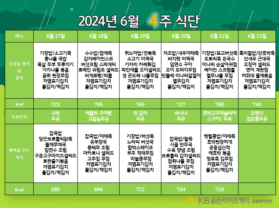 위례케어센터 [식단안내] 위례 케어센터 6월 4주차 식단표 페이지 정보 작성자 KB 골든라이프케어 댓글 0건 조회 2,458회 작성일 24-06-14 12:56 목록 본문 목록 이전글[하루의 식단] 2024년 6월 14일 24.06.14 다음글[식단안내] 위례 빌리지 6월 4주차 식단표 24.06.14