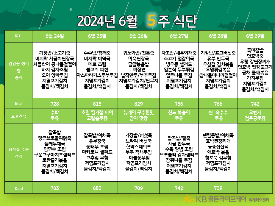 위례케어센터 [식단안내] 위례 케어센터 6월 5주차 식단표 페이지 정보 작성자 KB 골든라이프케어 댓글 0건 조회 2,431회 작성일 24-06-20 15:10 목록 본문 목록 이전글[식단안내] 위례 빌리지 6월 5주차 식단표 24.06.20 다음글[하루의식단] 2024년 6월 18일 24.06.20