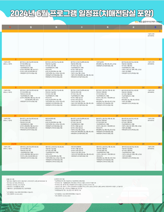 위례빌리지 [프로그램 안내] 2024년 위례 빌리지 6월 프로그램 일정표 페이지 정보 작성자 KB 골든라이프케어 댓글 0건 조회 2,658회 작성일 24-06-03 17:29 목록 본문 목록 이전글[오늘의 식단] 2024년 6월 04일 중식 24.06.04 다음글[프로그램 안내] 2024년 서초 빌리지 6월 프로그램 일정표 24.06.03