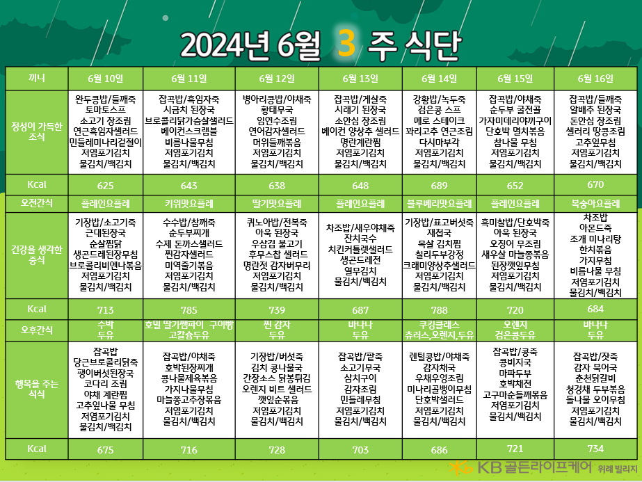 위례빌리지 [식단안내] 위례 빌리지 6월 3주차 식단표 페이지 정보 작성자 KB 골든라이프케어 댓글 0건 조회 2,382회 작성일 24-06-06 22:51 목록 본문 목록 이전글[오늘의 식단] 2024년 06월 07일 중식 24.06.07 다음글[식단안내] 위례 케어센터 6월 3주차 식단표 24.06.06