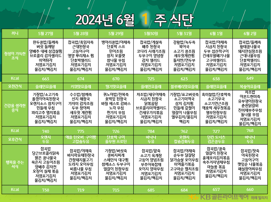 위례빌리지 [식단안내] 위례 빌리지 6월 1주차 식단표 페이지 정보 작성자 KB 골든라이프케어 댓글 0건 조회 2,285회 작성일 24-05-23 17:57 목록 본문 목록 이전글[하루의 식단] 2024년 5월 25일 24.05.26 다음글[식단안내] 위례 케어센터 6월 1주차 식단표 24.05.23